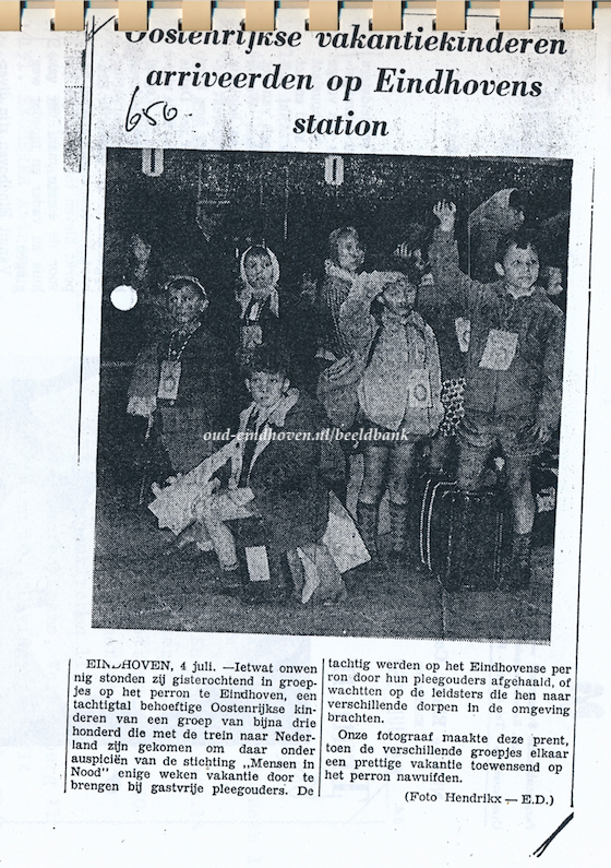 In de 50er jaren werd er een oproep door Mensen in Nood in diverse kerken gedaan om kinderen uit Oostenrijk een mooie vakantie te geven om aan te sterken. Ook in ons gezin kwam dit aan de orde en werd besloten zich aan te melden voor een jongen. Dit om mijn moeder op te beuren die toen net een miskraam had gehad. Het werd geen jongen maar zijn zus omdat de ouders het niet riskeerde dat hun enige zoon niet terug zou komen. Vele jaren later realiseerde ik pas dat Oostenrijk toen net bevrijd was. Kortom 12 jaar later als wij. Deze beslissing heeft er in ons gezin aardig in gehakt .Gelukkig maar, we hebben als gezin nu nog steeds een enorme band met hun. De afstanden zijn nu niet meer zo groot. Maar destijds zaten de kinderen met velen in een trein ruim 18 uur en kwamen dan in een vreemd land aan waar beide elkaars taal niet verstonden. De kinderen kwamen in Eindhoven aan om naar de ouders mee naar huis te gaan naar de Stad en enkele dorpen om ons heen.Vandaar uit ging de trein door naar andere steden.